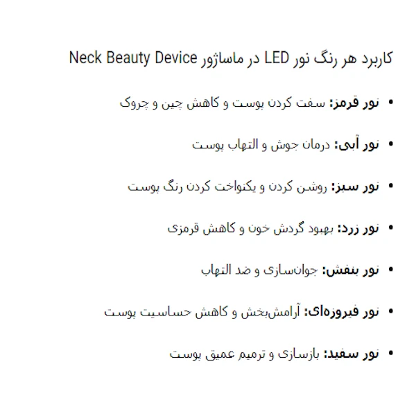 کالای فوق با هفت رنگ درمانی و ویبره و امواج فراصوت سبب لیفت پوست و روشن شدن و از بین بردن لکه های پوستی می شود دستگاه شارژی بوده و مناسب استفاده در منازل یا آرایشگاهها می باشد